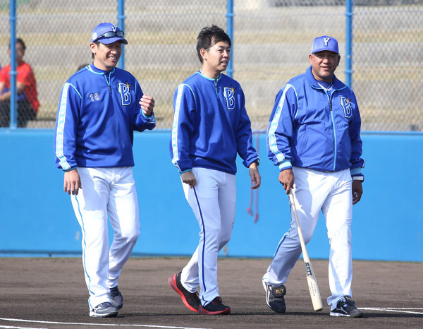 キャンプで談笑するラミレス監督と三浦コーチ(左)(C)日刊ゲンダイ
