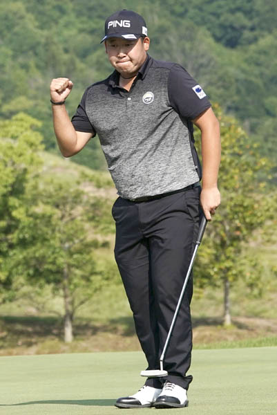 星野陸也とのプレーオフを制しガッツポーズの大槻智春(C)共同通信社