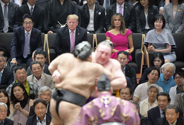 千秋楽を観戦する(上左から)安倍首相、トランプ大統領、メラニア夫人、昭恵夫人(代表撮影)