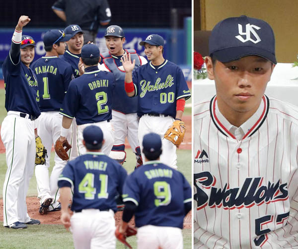 連敗ストップを喜ぶナイン(右は2016年入団会見での古賀優大)/(C)共同通信社