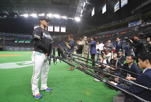 プロ初の札幌ドーム練習後な取材に応じた吉田輝星(C)日刊ゲンダイ