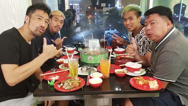食事をしながらコミュニケーションを図る片野(左端・本人提供)
