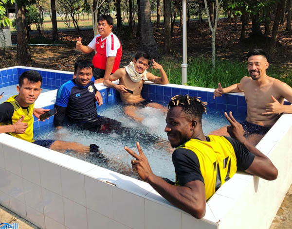 練習後、チームメートとクールダウン(右端・本人提供)