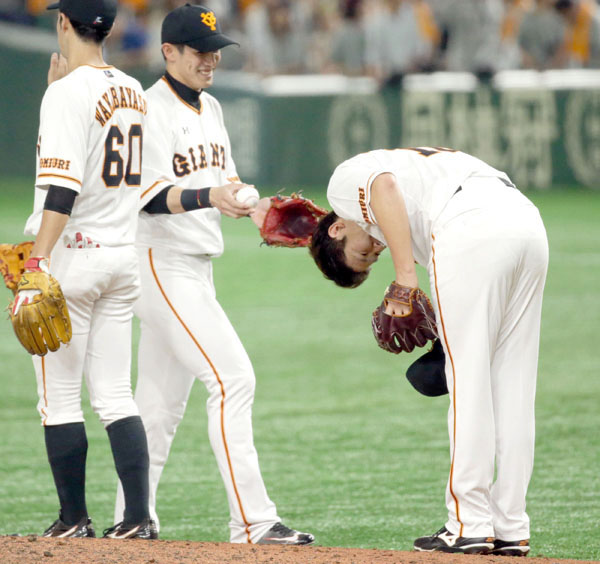ファインプレーの陽岱鋼に深々と頭を下げる菅野(C)日刊ゲンダイ
