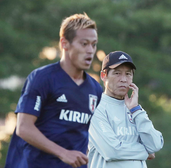 ロシアW杯前の合宿でMF本田の動きを見つめる西野監督(右)/(C)日刊ゲンダイ