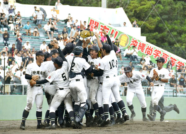 5年ぶり8度目の出場を決め喜ぶ沖縄尚学ナイン(C)共同通信社