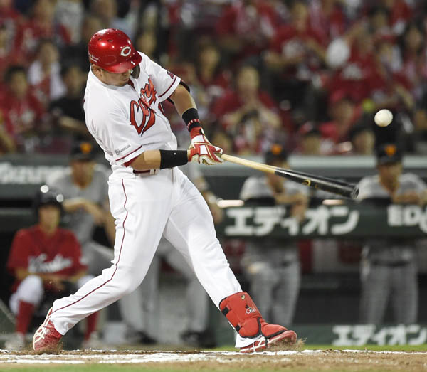 巨人戦でサヨナラ打を決めた鈴木誠也(21日)/(C)共同通信社