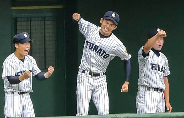 ベンチで大喜びする佐々木(C)共同通信社