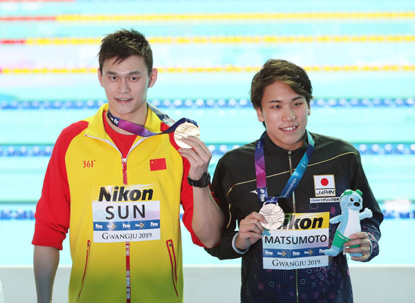 メダルを手にする孫楊(左)と松元(C)ロイター
