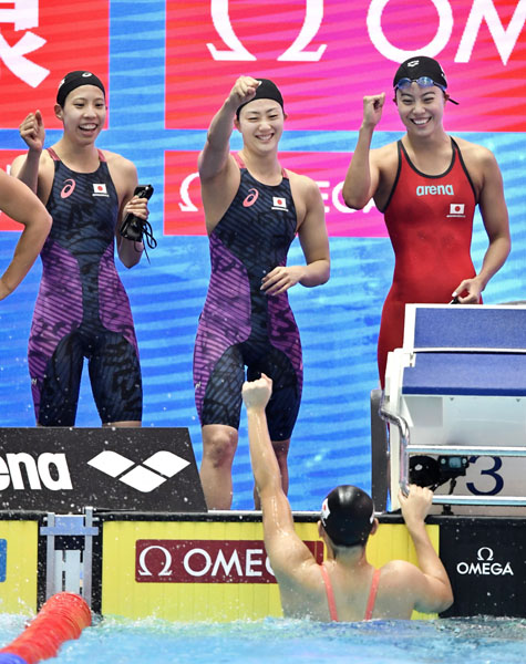 女子400メートルリレーで第1泳者として五輪出場枠獲得に貢献した大本(右)/(C)日刊ゲンダイ
