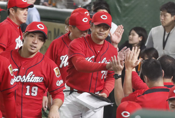 中1日の巨人戦に勝ってナインとタッチする緒方監督(中)(C)日刊ゲンダイ