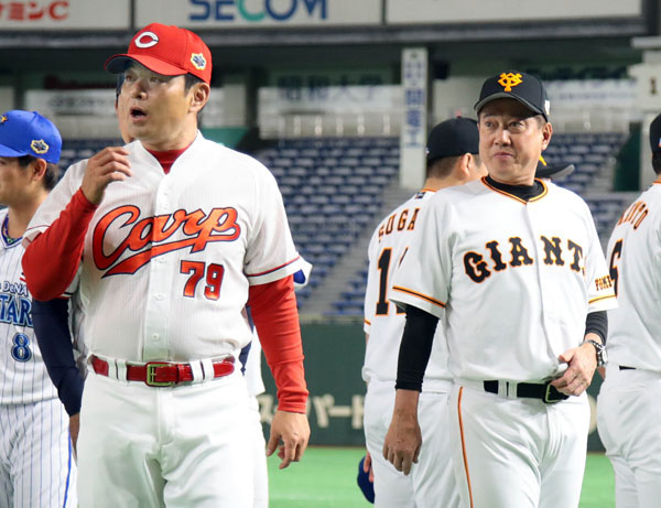 緒方監督(左)と原監督(C)日刊ゲンダイ