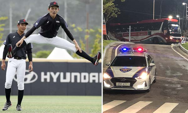公式練習で調整する佐々木と奥川(左)、パトカーに先導され宿舎に向かう日本代表のチームバス(C)共同通信社