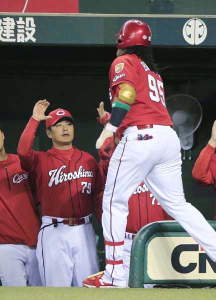 広島では事件続出(緒方監督とタッチするバティスタ)/(C)日刊ゲンダイ