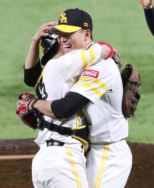 甲斐(左)と抱き合う千賀(C)共同通信社