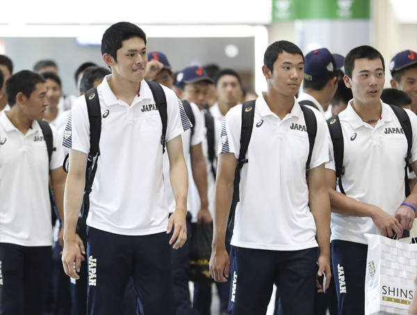 搭乗便が到着せず韓国に延泊することになったU18代表(手前左は佐々木、右は奥川)/(C)共同通信社