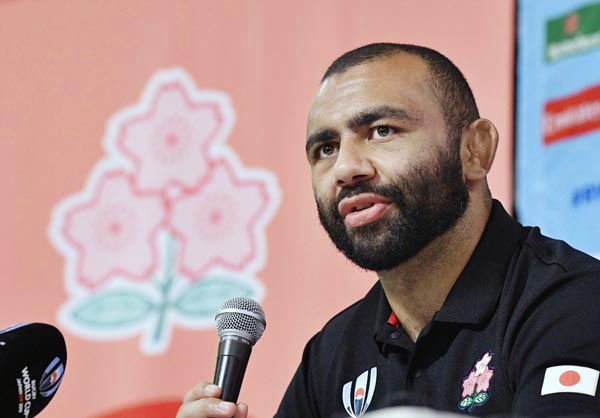 開幕前に記者会見する日本代表のリーチ・マイケル主将(C)共同通信社