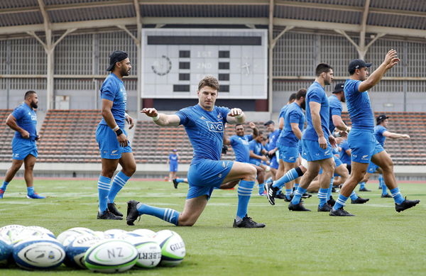 調整するニュージーランド代表の司令塔B・バレット(手前)ら(C)共同通信社