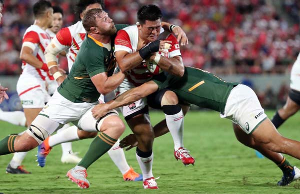 初のベスト8目指す日本代表(南ア戦での日本代表プロップ具智元)/(C)日刊ゲンダイ