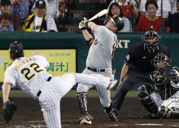 九回に代打で登場し、空振り三振に倒れる阿部(C)共同通信社