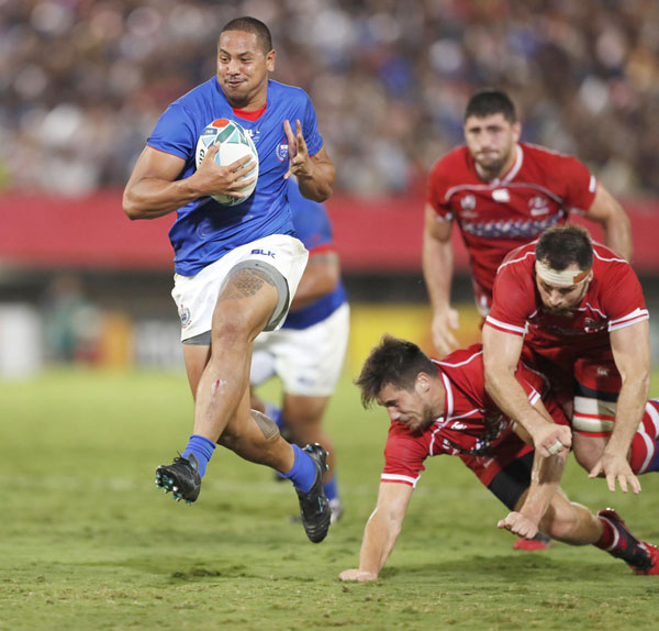 ロシア戦の後半、抜け出しトライを決めるサモアのフィドウ(C)共同通信社