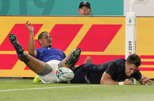 スコットランド戦で相手腹部に膝を入れたサモアのフィドウ(左)/(C)日刊ゲンダイ