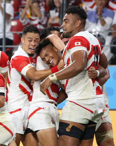 試合終了間際、左サイドでパスを受けトライを決めた松島幸太朗(中央)(C)日刊ゲンダイ