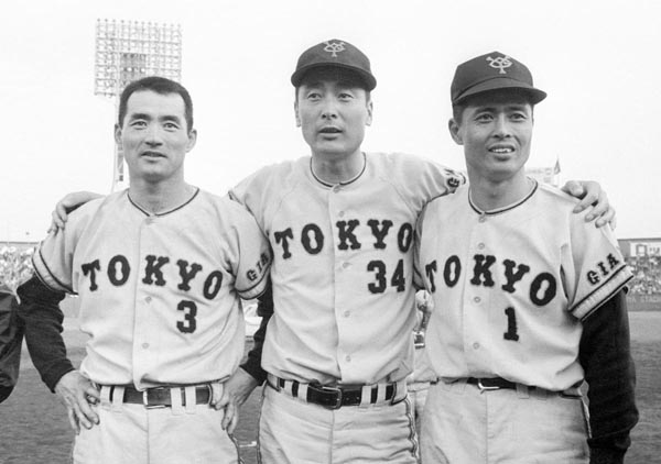 ONと肩を組む巨人時代の金田正一氏(中央・1969年)/(C)共同通信社