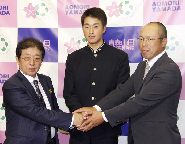 巨人から1位指名の堀田賢慎投手。青森山田高の花田校長(左)と兜森崇朗監督(右)と(C)共同通信社