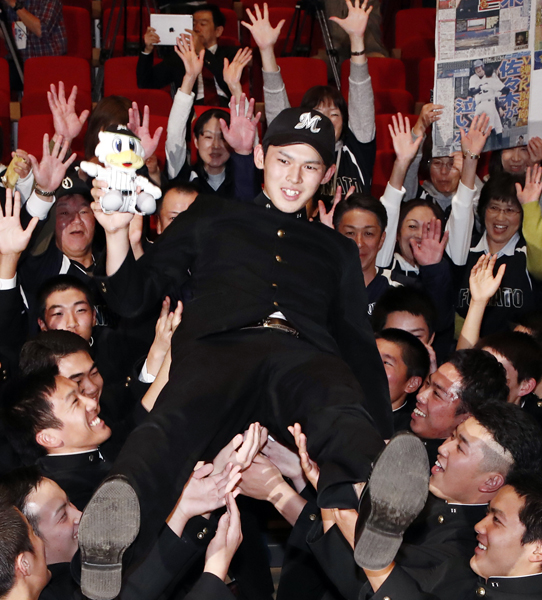 仲間に胴上げされる大船渡の佐々木(C)日刊ゲンダイ