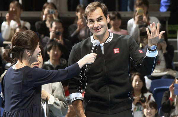 有明のイベントでインタビューに答えるフェデラー(C)共同通信社