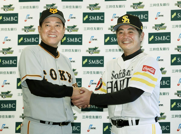 監督会議で握手をする原(左)、工藤両監督(C)共同通信社