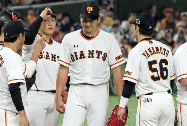 4戦目に負け投手になった菅野(央)は拙守に足を引っ張られて降板した(C)日刊ゲンダイ