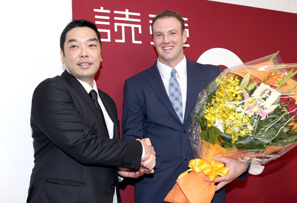 引退会見をしたマシソン(右)はサプライズで阿部から花束を受け取る(C)日刊ゲンダイ