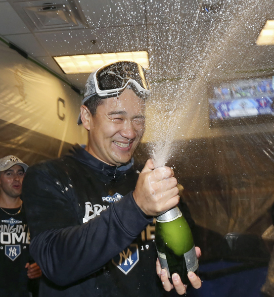 リーグ優勝決定戦進出を決め、シャンパンファイトをするヤンキース・田中(C)共同通信社