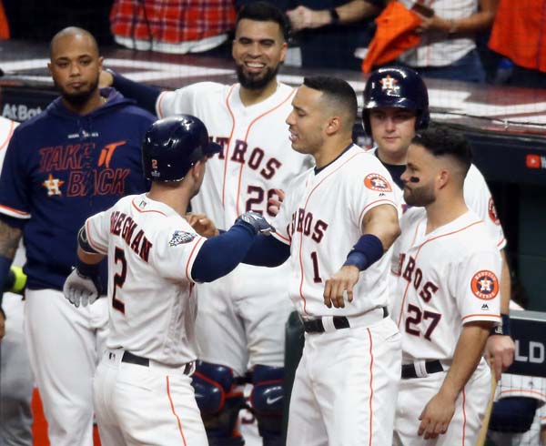 Wシリーズ第6戦で本塁打を放ったブレグマン(2)を迎えるアストロズナイン(C)ロイター/USA TODAY Sports