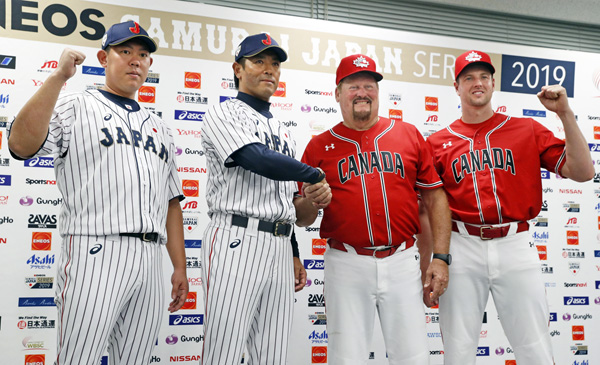 代表戦でもこれじゃあ(会見を終え、記念撮影する〈左から〉日本代表の山口、稲葉監督、カナダ代表のウィット監督、マシソン)/(C)共同通信社
