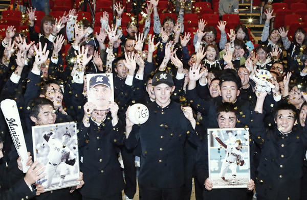 ロッテ1位指名で級友らに祝福される佐々木(中央)/(C)日刊ゲンダイ
