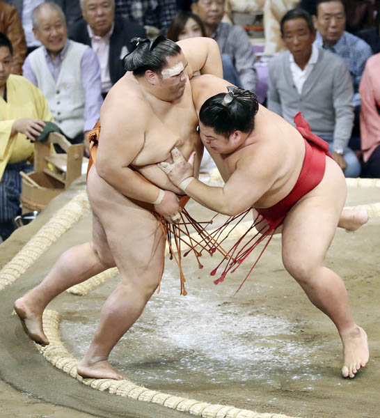 御嶽海(左)は大栄翔に完敗(C)共同通信社