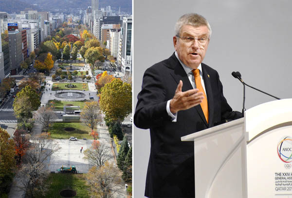 表彰式も札幌で?(IOCのバッハ会長=右)/(C)共同通信社