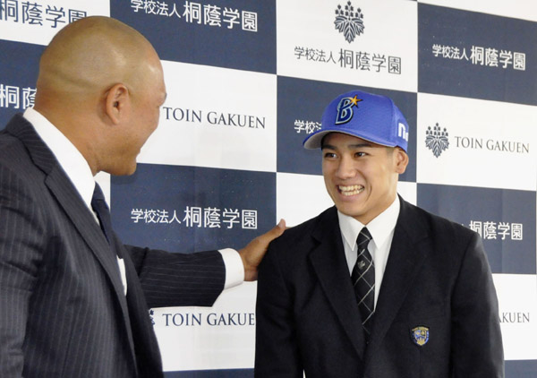 DeNA・ラミレス監督(左)からドラフト1位指名のあいさつを受ける森敬斗(C)共同通信社