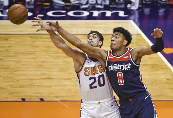 サンズ戦でリバウンドを競り合うウィザーズの八村(右)/(C)共同通信社