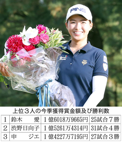 ポイントランキング1位になり花束を贈られた渋野(C)日刊ゲンダイ