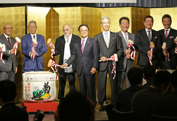権藤博氏 殿堂入り祝賀パーティー(左から山下大輔氏、権藤博氏、松山千春氏、倉本昌広氏、山田久志氏、東尾修氏、原辰徳監督、小久保裕紀氏)/(C)日刊ゲンダイ