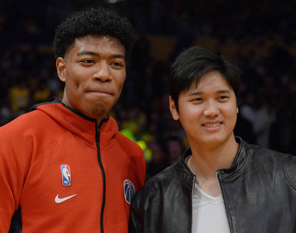 日本時間11月30日、ウィザーズ戦を観戦し、八村と記念撮影した大谷(C)ロイター/USA TODAY Sports