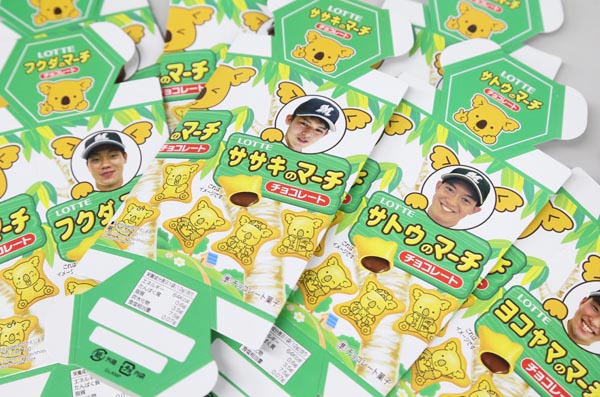 新人選手の顔写真が入った「コアラのマーチ」も登場(C)日刊ゲンダイ