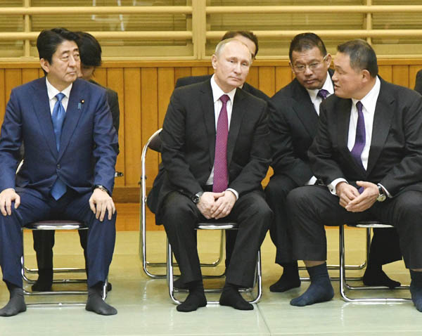 安倍首相を横にして話し込むプーチン大統領(中)と山下氏(右)/(C)JMPA