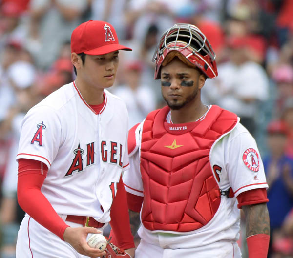 18年にマルドナード(右)とバッテリーを組んだ大谷(C)ロイター/USA TODAY Sports
