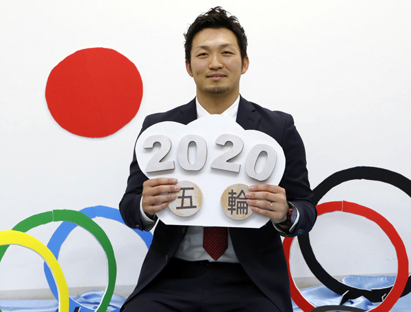 「2020五輪」のボードを手に笑顔の鈴木(C)共同通信社
