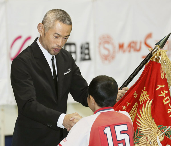 野球大会の閉会式で選手を表彰するイチロー(C)共同通信社
